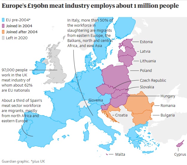 Európsky mäsový priemysel je veľmocou niekoľkých miliárd libier, ktorá zamestnáva približne 1 milión ľudí. Odbory ale odhadujú, že tisíce pracovníkov sú v niektorých krajinách zamestnaní prostredníctvom subdodávateľov a agentúr, pričom niektorí zarábajú o 40% až 50% menej ako zamestnanci v rovnakých továrňach.
